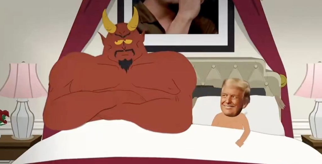 Ahhhhhh y sin mencionar que, dentro del universo South Park, Donald Trump es el nuevo amante de Satán (lugar que antes ocupaba Saddam Hussein) y que le ruega por sexo… cosa que el amo de las tinieblas le niega dada la insistente vinculación del presidente con la lista de clientes de Jeffrey Epstein.