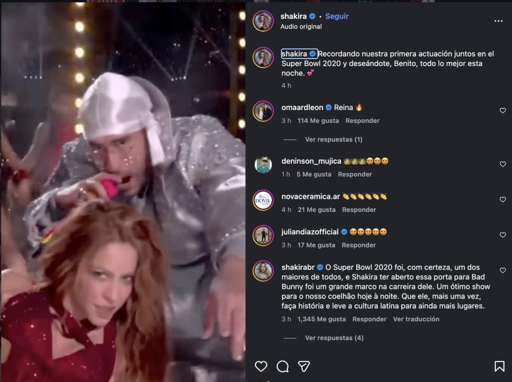 También Shakira le dedicó una publicación en Instagram donde le deseó lo mejor para el show de medio tiempo del Super Bowl, recordando la vez que ella tuvo al mismo Bad Bunny como invitado del show en el 2020.