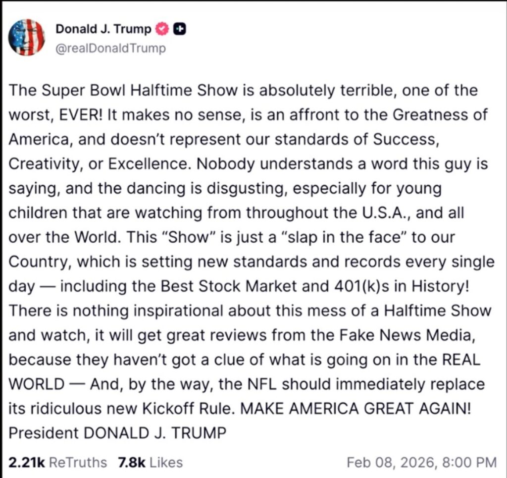 Aunque Donald Trump se las dio en días pasados de que no vería el show del medio tiempo del Super Bowl con Bad Bunny, al final parece que sí lo vio y rebuznó como se esperaba, jajaja.