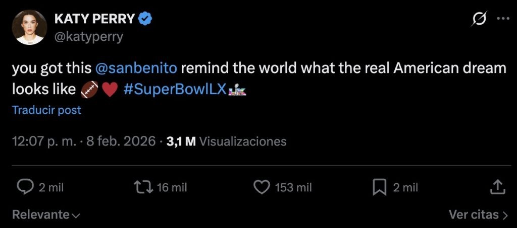Incluso en la previa del Super Bowl, algunos famosos ––desde latinos hasta estrellas anglo–– expresaron apoyo para Bad Bunny. Por ahí, Katy Perry y el actor Jon Hamm dedicaron mensajes al cantante puertorriqueño.