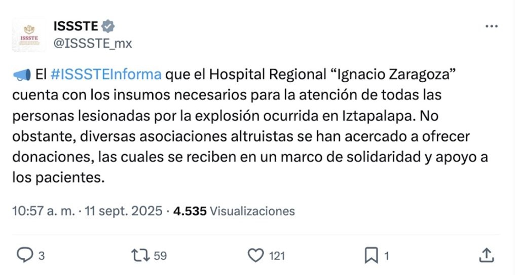 Sin embargo, en cuanto a los insumos médicos, el ISSSTE aseguró que sus hospitales cuentan con lo necesario para la atención de los/las pacientes víctimas de la explosión en Iztapalapa.