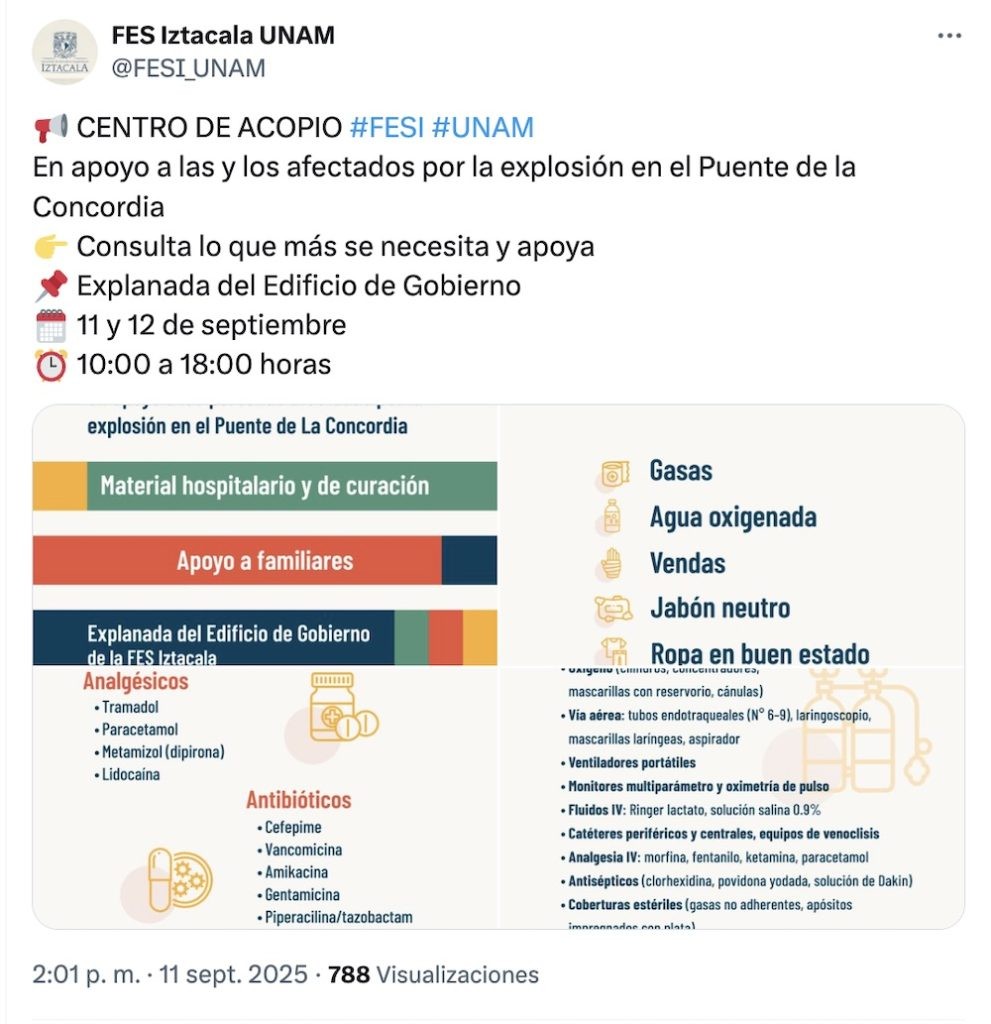 En la explanada de la FES Iztacala está habilitado un centro de acopio que estará abierto entre el 11 y 12 de septiembre de 10 de la mañana a 6 de la tarde. Los insumos que están recibiendo son: