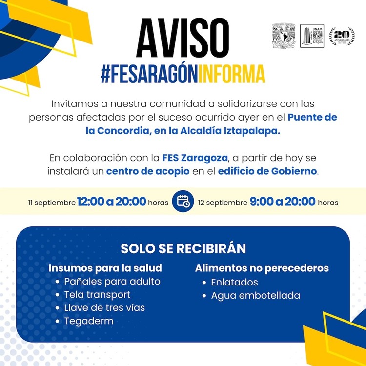 La FES Aragón también habilitó un centro de acopio en el edificio de Gobierno que estará funcionando el 11 de septiembre hasta las 8 de la noche y el 12 de 9 de la mañana a 8 pm. Por allá están recibiendo: