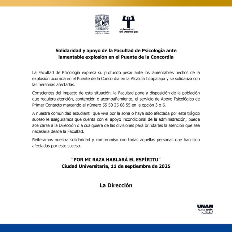 También están brindado apoyo psicológico. Si quieren una cita pueden comunicarse a los siguientes números: 55 5623 0590 – 55 5623 0648.