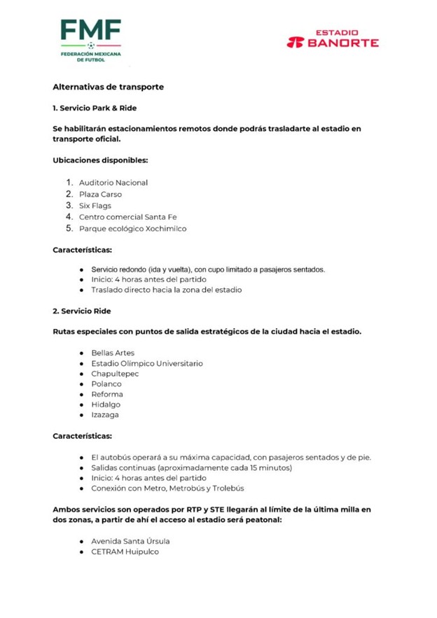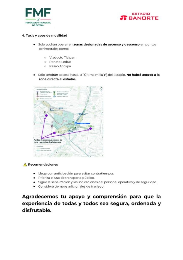 Explicó que no habrá acceso vehicular en un kilómetro a la redonda en el Estadio Banorte, por lo cual los aficionados tendrán que caminar un tramo para ingresar al inmueble, especialmente aquellos que arriben en autobuses o combis que llegan por Tlalpan o Circuito Estadio Azteca.