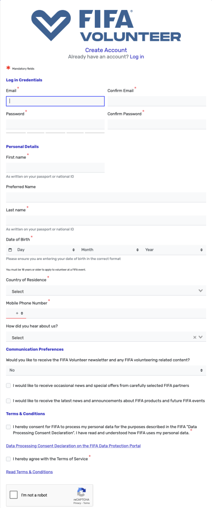 Ya comenzó el registro para voluntarios de la FIFA. Lo primero que deben tener a la mano es su correo electrónico, la contraseña que van a usar en la cuenta de voluntarios, fecha de nacimiento, país de residencia y su número telefónico.